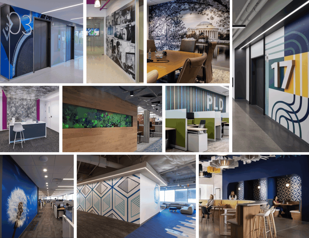 If you are aiming for an inviting atmosphere or a peaceful, focused environment, an accent wall can transform your workspace into a welcoming space. A feature wall can enhance your company’s branding message, improve wayfinding, create memorable focal points, or an artistic expression, leaving a lasting impression. From bold dramatic statements to subtle, calming tones, the possibilities are endless. A well-designed accent wall not only enhances your office’s aesthetic but can create a soothing environment, helping employees feel more connected and at ease. In today’s hybrid work environment, bringing employees back to the office requires spaces that make them feel comfortable and motivated to be there. A feature wall can foster a sense of community engagement, creating a space to encourage social interaction and community building. Accent walls are a wonderful way to serve as a focal point and incorporate employee-centric design, enhancing both comfort and productivity by creating a space that fosters well-being and engagement. Ready to enhance your workspace? Our expert design team can help you craft the perfect accent wall that aligns with your brand and vision. Keep reading for expert tips on how we can help you design the perfect accent wall to improve your office interior.