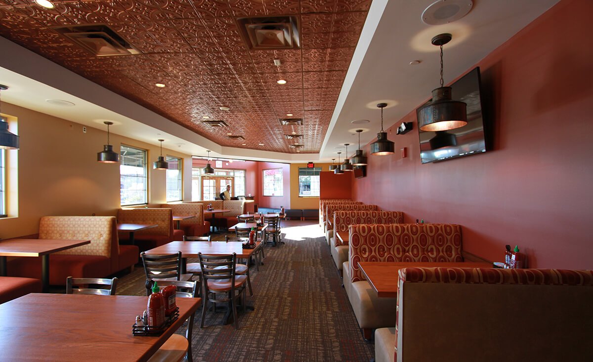 The existing building was vacant for five years and presented a host of challenges. The complete interior was gutted to provide a clean slate for the new tap house. Bright copper accents behind the bar, a VIP lounge with a curved ceiling and illuminated glass bubbles, tin copper ceilings, and motorcycles hung from the ceiling above, give the space an energizing atmosphere.