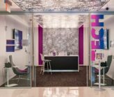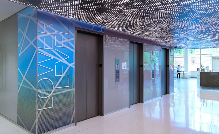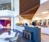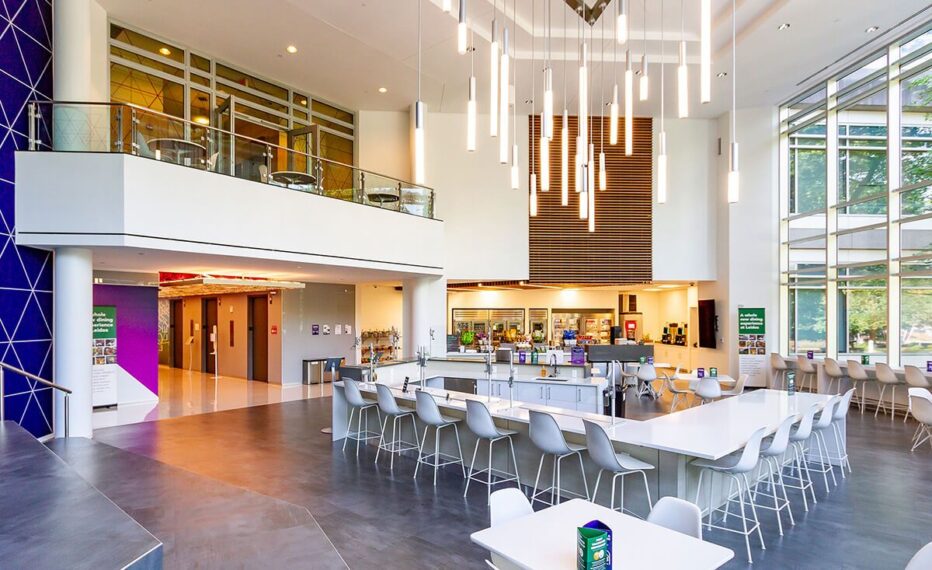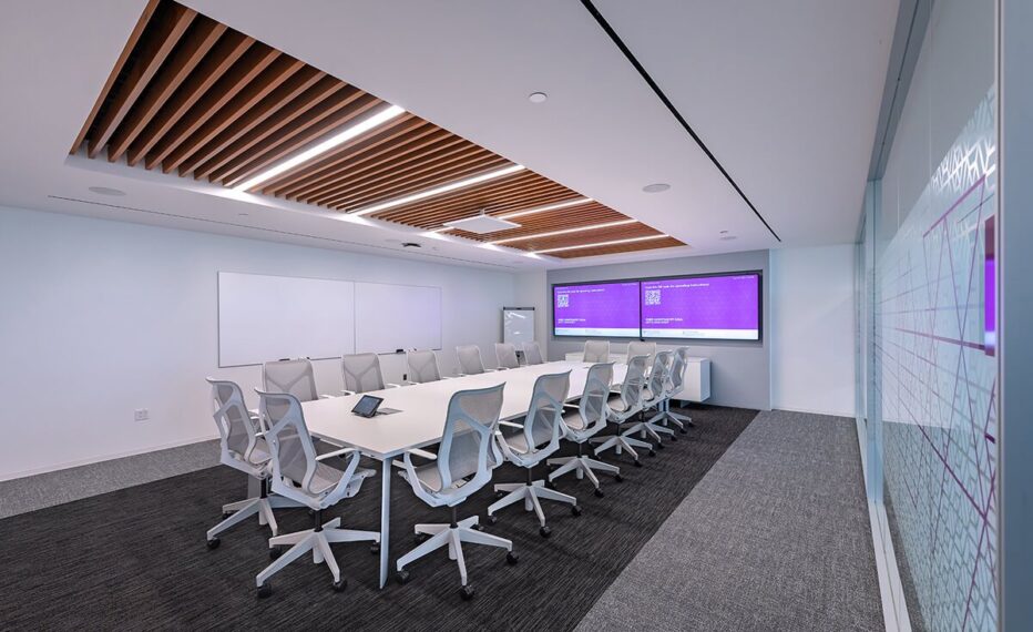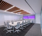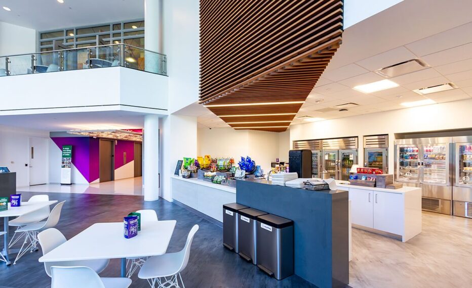 The design direction for the project was to blend Leidos’ visionary, smart, approachable, authentic, and pragmatic philosophies to create a space of optimal collaboration and successful workflow for the company to complete various crucial tasks. Building improvements include complete renovations to building amenity spaces such as elevator lobbies, gymnasium, and the addition of a new micro market that features a social seating space and community stair. Additionally, an entire wing of the building was designed as a secure area suite of 25,000 SF, including a data center, work labs, and general office area. The remaining work areas were renovated into open office spaces to maximize occupancy and collaboration. The floor layouts include break areas, large conference rooms, small meeting rooms featuring frameless glass walls, accent finishes, and exposed ceiling design and accent ceiling specifications. Small-sized module meeting rooms are placed throughout. Unique office spaces such as the technology room incorporate a common branding thread with distinctive finishes and graphics.