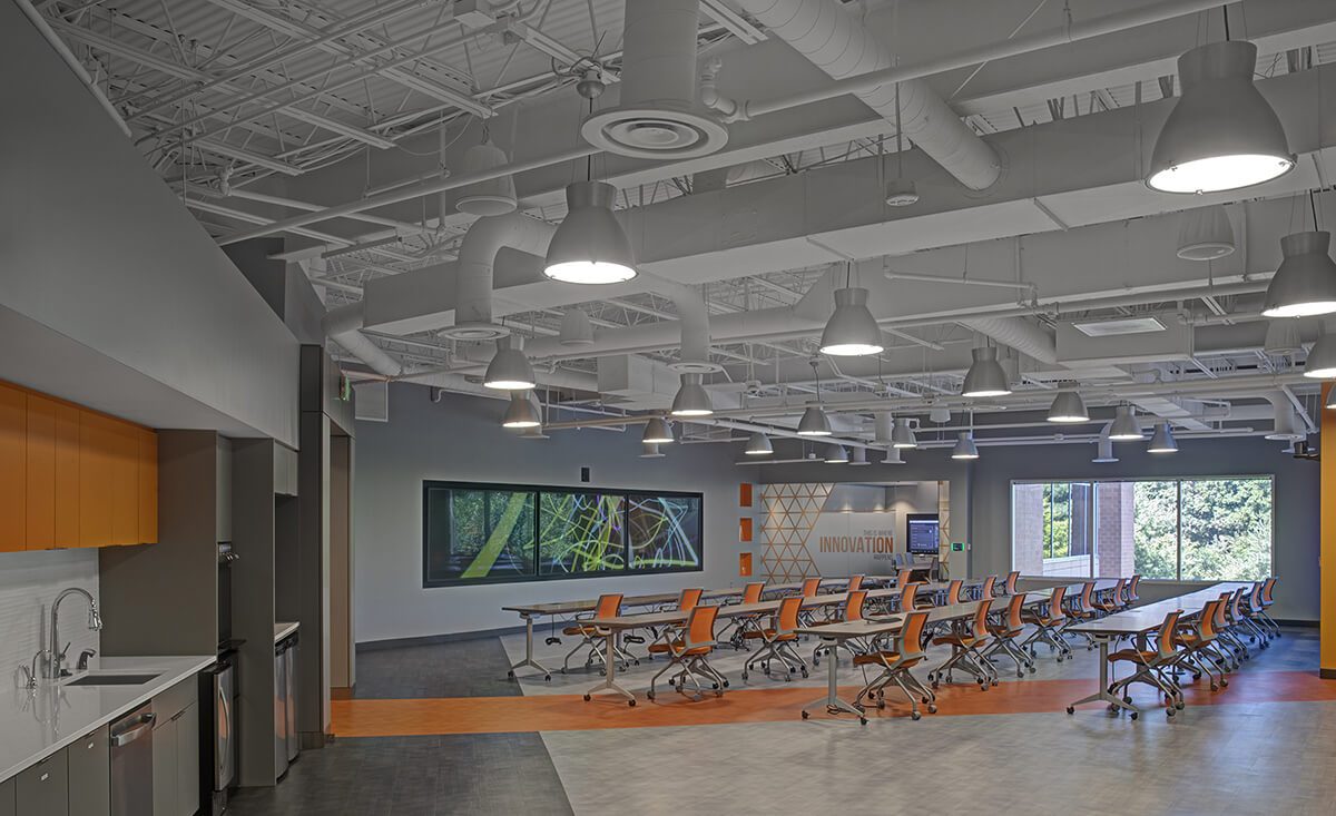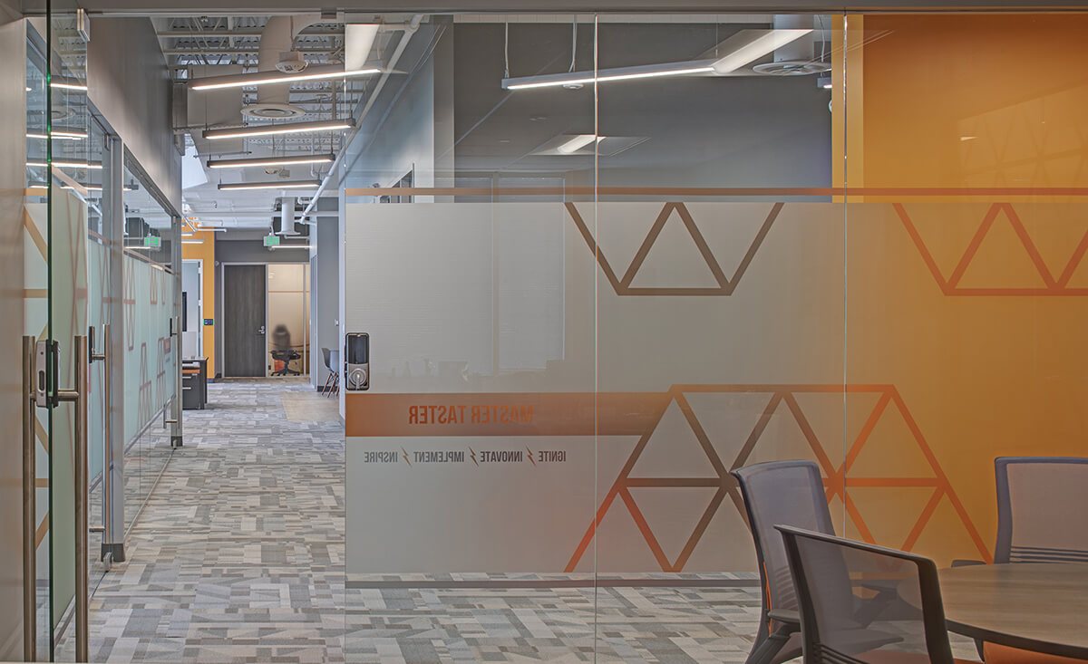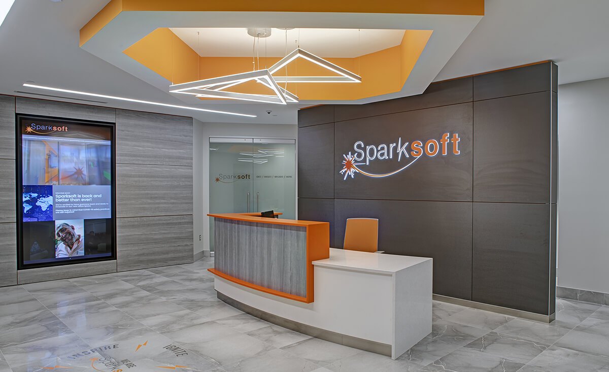 Sparksoft, an innovative IT solutions company, expanded its office in Columbia, Maryland. The company sought a bright, bold, modern office with multi-functional spaces, open collaboration areas, and architectural elements designed with a common thread of branding woven throughout.