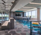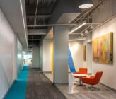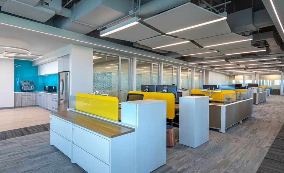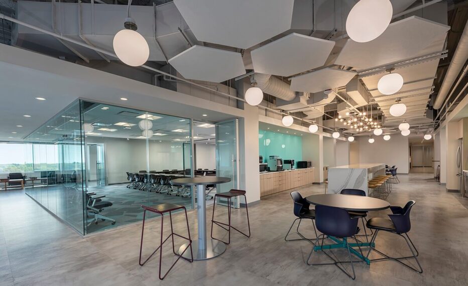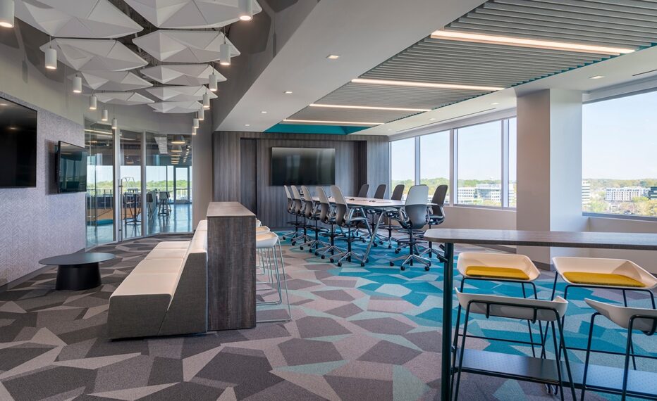 The workspace includes themed finishes, unique specialty lighting, acoustical treatments, glass front offices, and workstations along the perimeter allowing natural light throughout. A multi-purpose training room, conference rooms, huddle rooms, and ample amenity spaces reinforce flexibility and collaboration. A large and open community stair connects the 11th and 12th floors and functions as a seating area for casual gatherings. A one-of-a-kind custom treelike column feature sets the mood for the space. Surrounding the community stair is a catering space, which serves as the main dining area. An outdoor terrace overlooks Merriweather Post Pavilion.